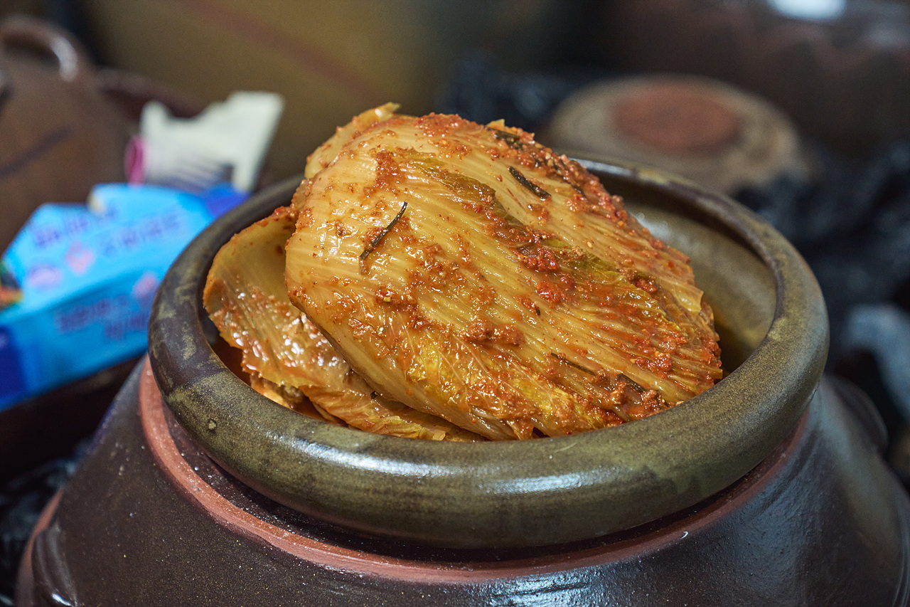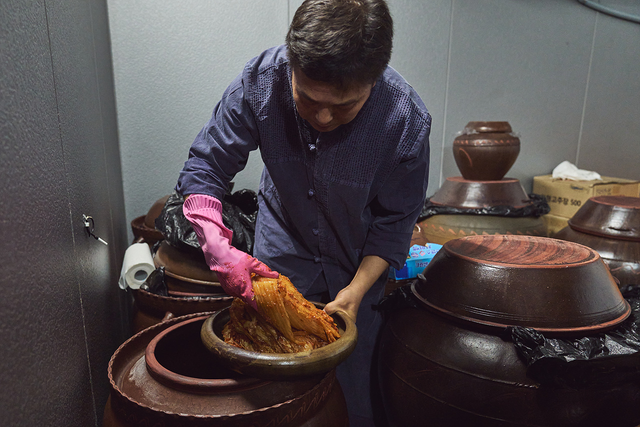 “보통은 배추 속에 양념을 넣잖아요. 근데 겉잎 한 장 넣고 양념 넣고, 또 겉잎 한 장 넣고 양념 넣고… 겹겹이 쌓는 것도 한 방법이에요. 젓갈 종류 바꾸는 것만으로도 완전히 다른 발효가 일어나요. 멸치액젓, 까나리액젓, 새우젓… 같은 염도여도 재료가 다르면 결과물이 달라지죠. 그래서 김치 담그기는 레시피가 아니라 실험입니다. 똑같이 담가도 매번 다르게 나와요.”
