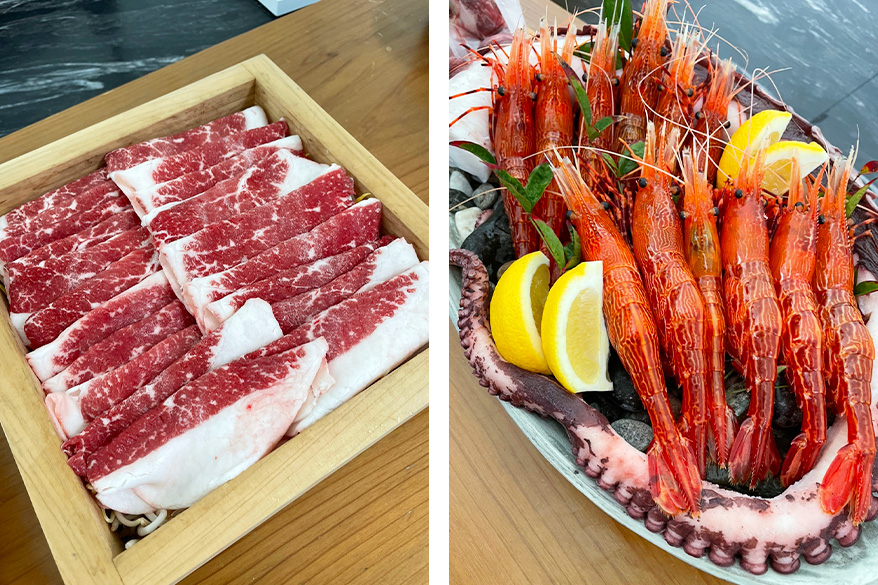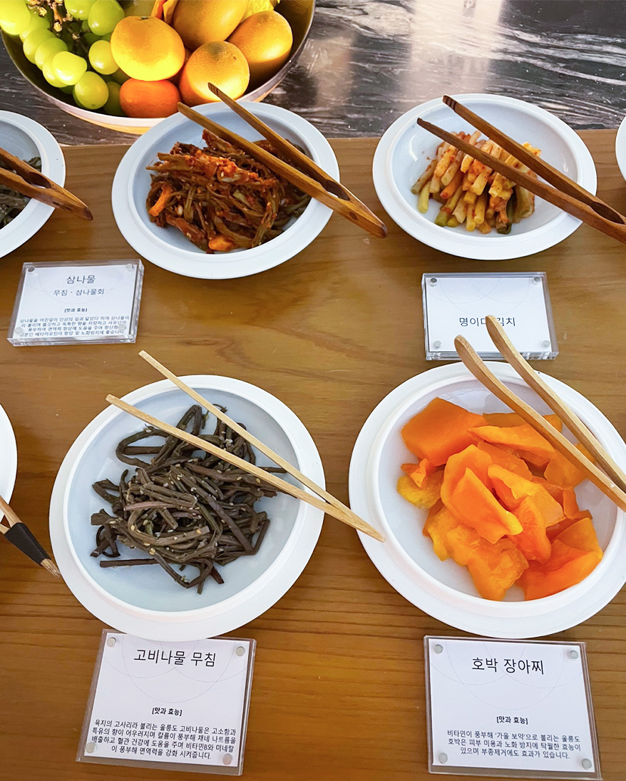 울릉도에서는 명이, 부지깽이, 더덕, 섬말나리, 호박, 홍감자 등 육지의 도시에서는 쉽게 접할 수 없는 재료에 흔치 않은 고유한 방식으로 나물을 무치고 장아찌를 만든다. 그렇게 준비한 다양한 채소류와 육류를 함께 즐기는 시간이었다. 울릉도의 다양한 나물을 먹고 자란 울릉도 칡소, 토종돼지 그리고 염소구이가 함께 하며 입안의 풍미를 돋기도 했다. 염소구이의 경우, 양념을 먼저 한 후 숯불에 굽고, 육수와 함께 조리하는 울릉도만의 염소 불고기 방식으로 만날 수 있었다. 울릉도 근처 청정해역에서 잡히는 꽃새우 구이의 풍미는 놓칠 수 없는 ‘바다의 맛’이었다.